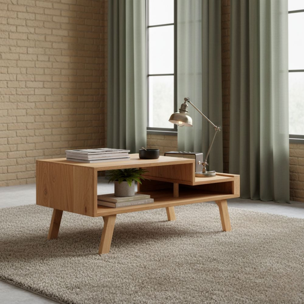 Bois massif plus travaillé, design plus affirmé, finitions plus élégantes. Les tables basses milieu de gamme
