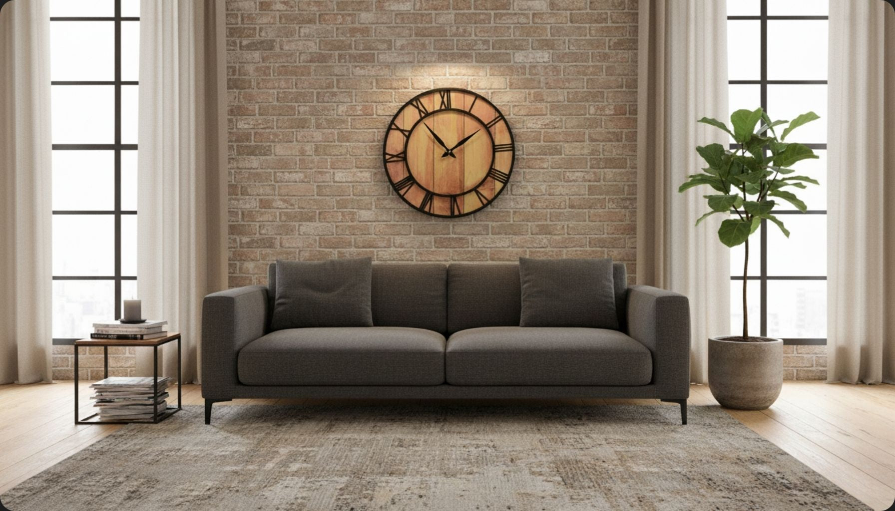 Dans le salon, une grande horloge murale devient un point focal puissant. Elle habille un mur nu au-dessus d’un canapé, d’un meuble TV ou d’un buffet. Dans l’entrée, elle donne le ton dès les premiers pas, en créant une atmosphère chaleureuse et structurée.