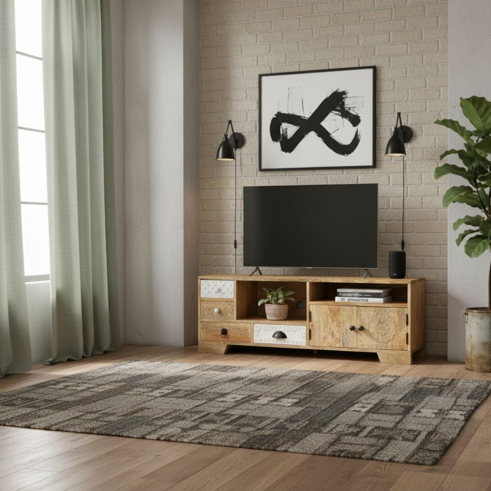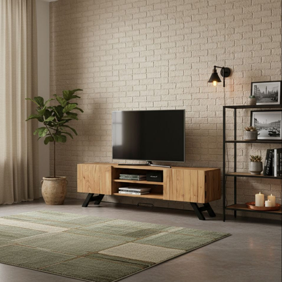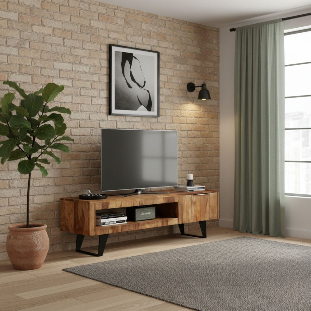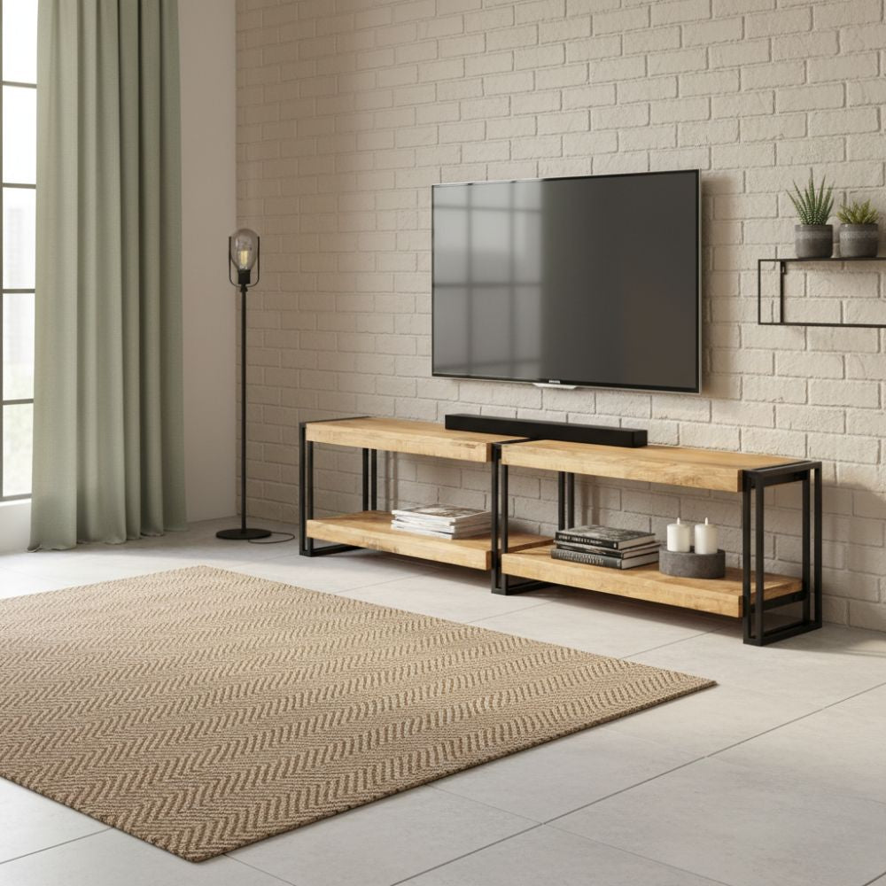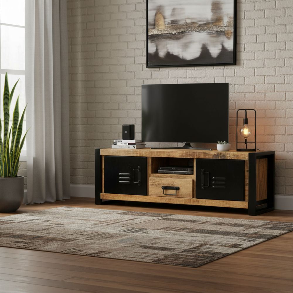 Le charme du meuble TV industriel repose avant tout sur ses matières premières. Le bois massif (souvent du manguier, du chêne ou de l’acacia) est travaillé pour laisser apparaître ses nœuds, irrégularités et veinures naturelles. Il est souvent associé à du métal noir, patiné ou vieilli, qui souligne les angles et les piétements.