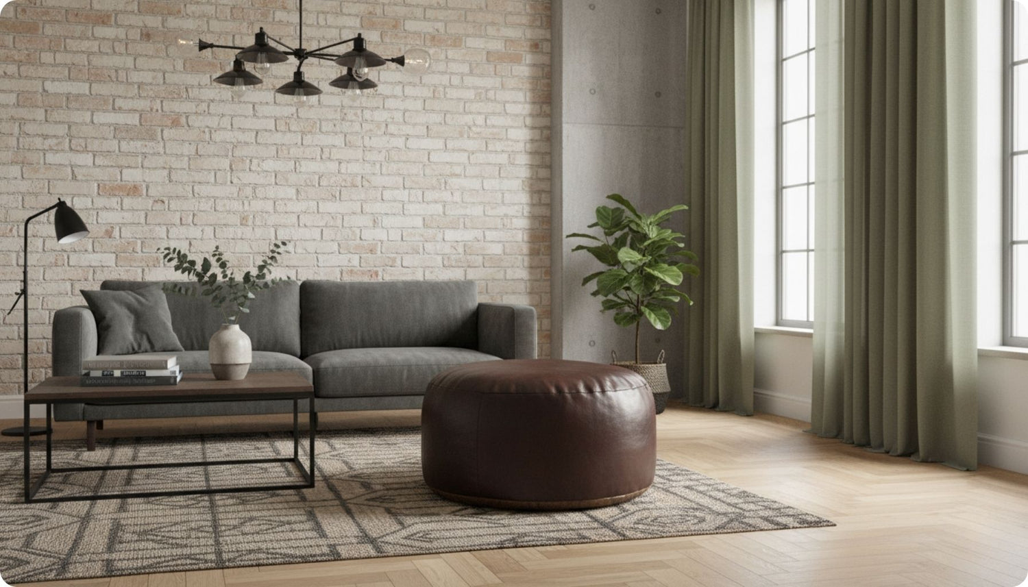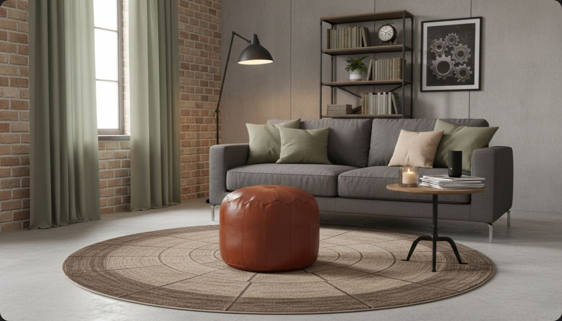 Dans un salon, c’est souvent au pied d’un canapé que le pouf s’installe naturellement. Il sert de repose-pieds, d’assise d’appoint pour les invités ou même de petite table basse si vous y posez un plateau. Et avec un modèle assorti à votre canapé en cuir ou fauteuil club, vous renforcez l’ambiance industrielle avec subtilité.