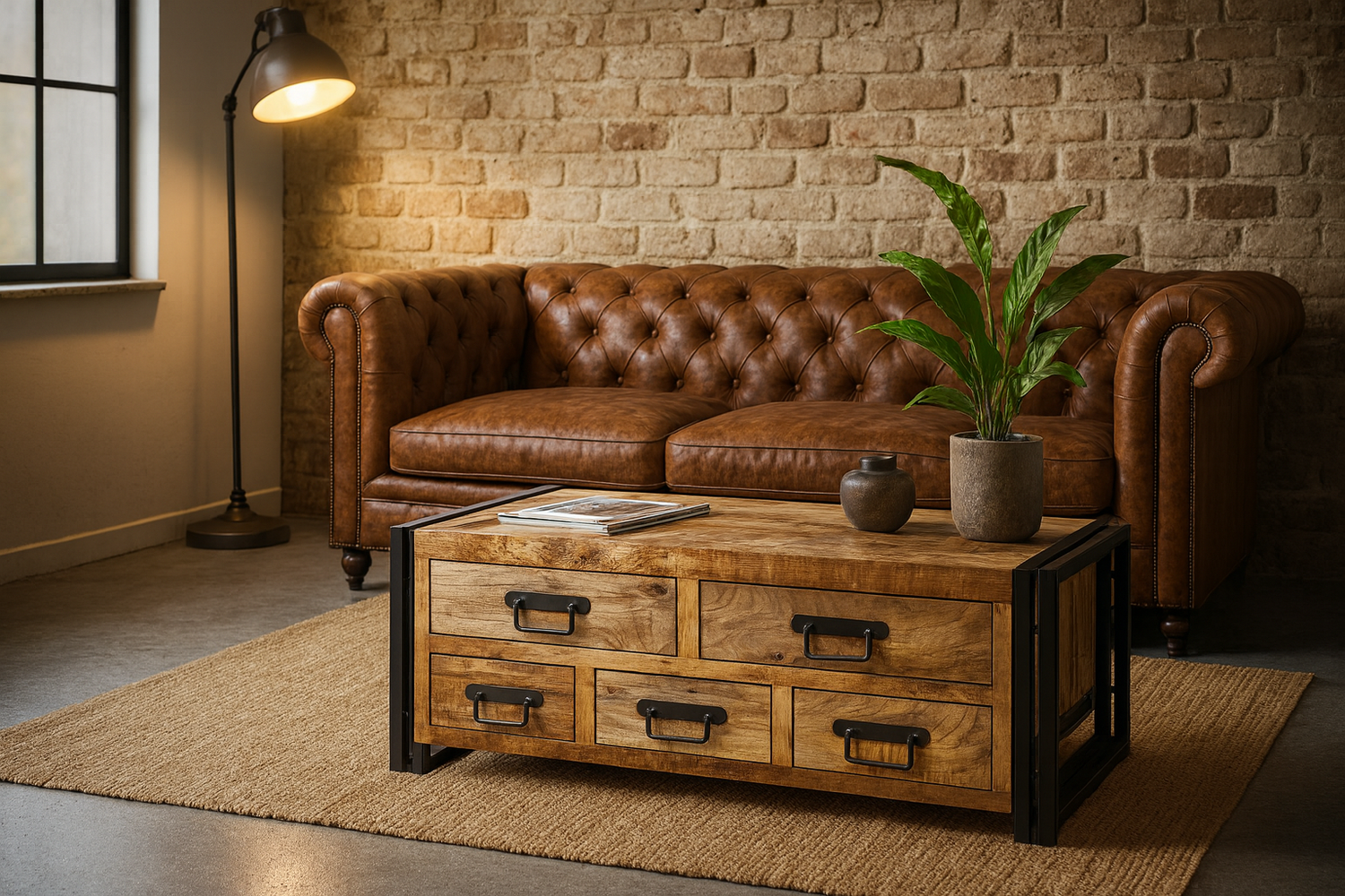 La table basse industrielle est un meuble à fort caractère, mais elle reste étonnamment facile à intégrer dans un salon. Que votre décoration soit purement industrielle, bohème chic ou plus contemporaine, il suffit de quelques ajustements pour en faire un véritable point focal dans la pièce.