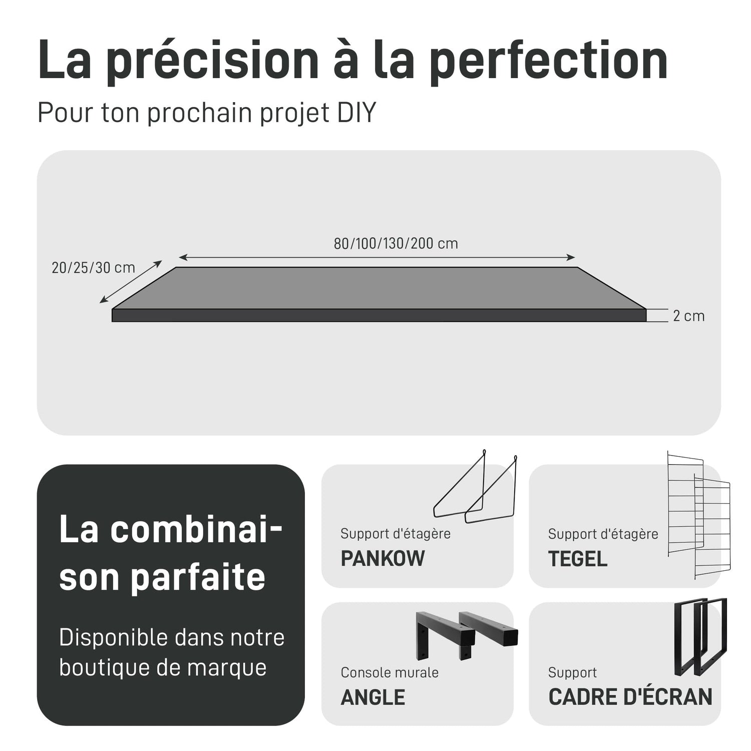 - Dimensions : Longueur 100 ou 200 cm, Profondeur 20, 25 ou 30 cm