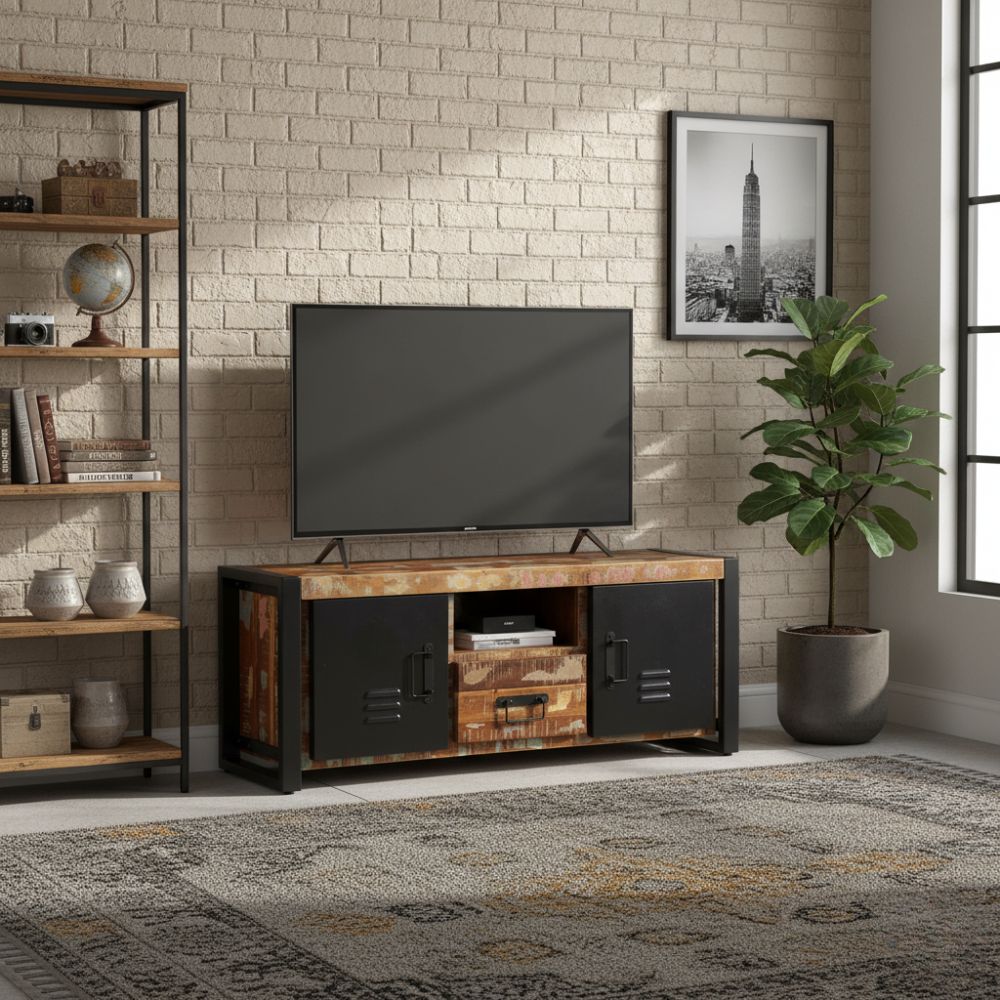 Découvrez l'élégance brute du bois de manguier massif avec ce meuble TV qui s'intègre parfaitement dans une décoration de style industriel. Conçu pour apporter chaleur et authenticité à votre salon, ce petit meuble TV bois offre également une robustesse incomparable grâce à ses matériaux de qualité.